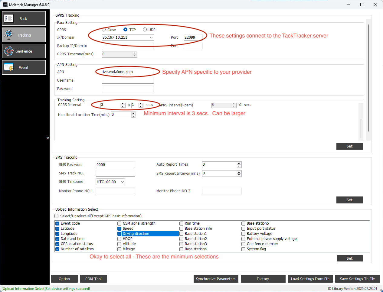 The configuration process and parameters vary according to the type of tracker, as described below. The manufacturer software and instructions are for Windows only. Please select your tracker type for detailed instructions: